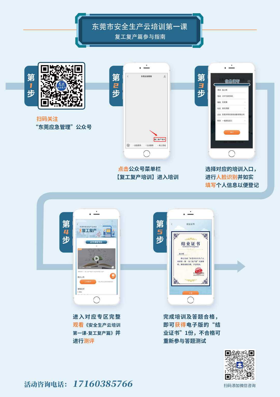 參與指南:關(guān)注“東莞應(yīng)急管理”公眾號,通過點擊公眾號菜單欄【線上活動→復(fù)工復(fù)產(chǎn)培訓(xùn)】,登記個人信息,完成注冊后,點擊“我要參加”進(jìn)入培訓(xùn)內(nèi)容界面,點擊觀看視頻進(jìn)行學(xué)習(xí)。