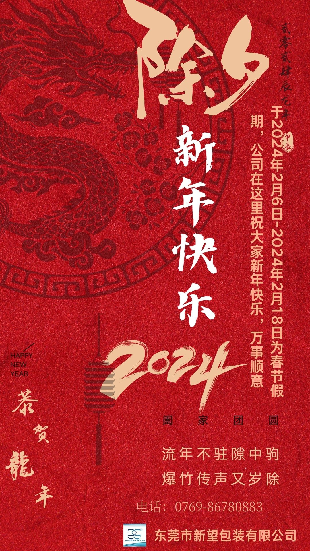 于2024年2月6日-2024年2月18日為春節(jié)假期,公司在這里祝大家新年快樂,身體健康、萬事順利!